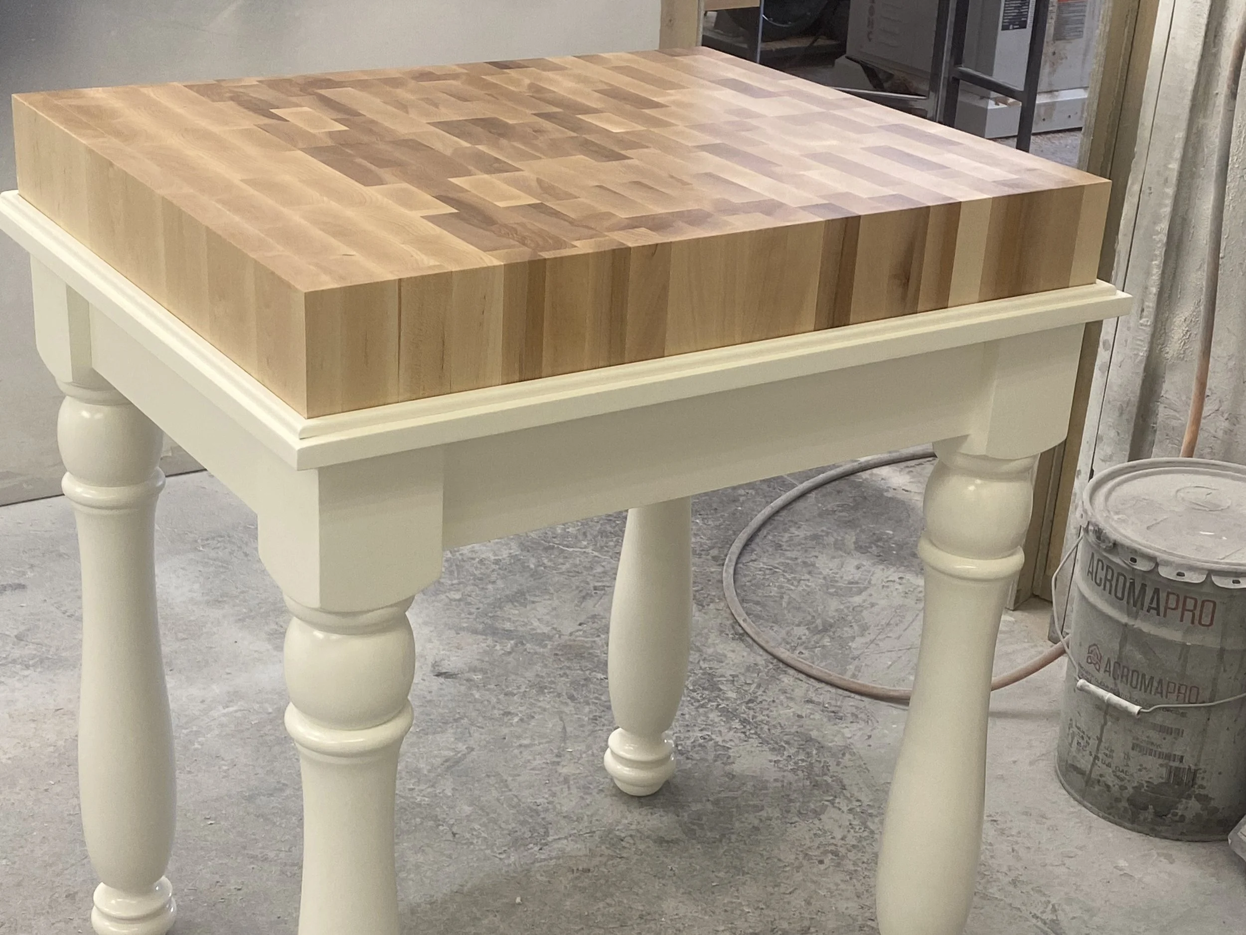 This one of a kind butchers block is a great mix of form and function. With a set of matching custom turned legs, topped with a nearly 3 inch thick end grain block, this piece not only added a lot of function to the clients kitchen, but also serves as an eye catching piece of furniture. To see more photos of this and other custom pieces our team has made over the years, click below.