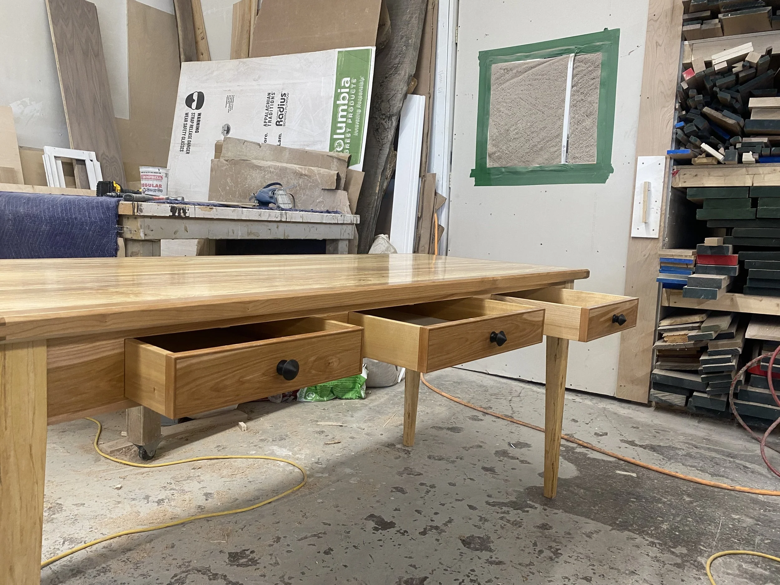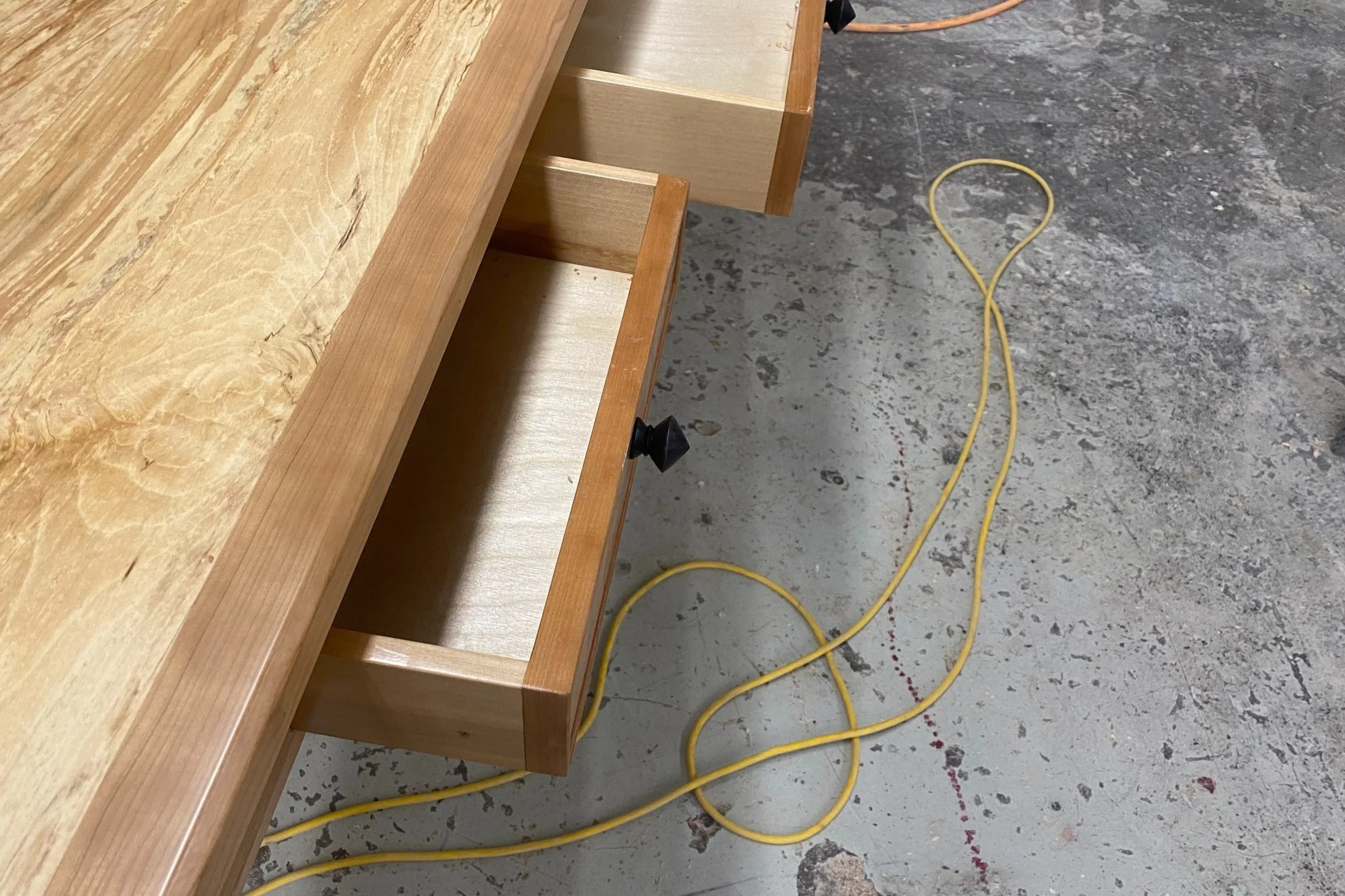 This spalted birch desk will catch the eye from every angle. The top was stabilized with a traditional breadboard ends to prevent cupping or bowing, also adding to its unique design. From the back of the desk, the matching ebony knobs were turned and polished by one of the members of our team, and add the little splash of contrast the desk needed to tie it all together. To see more photos of this unique piece and many others, click below.