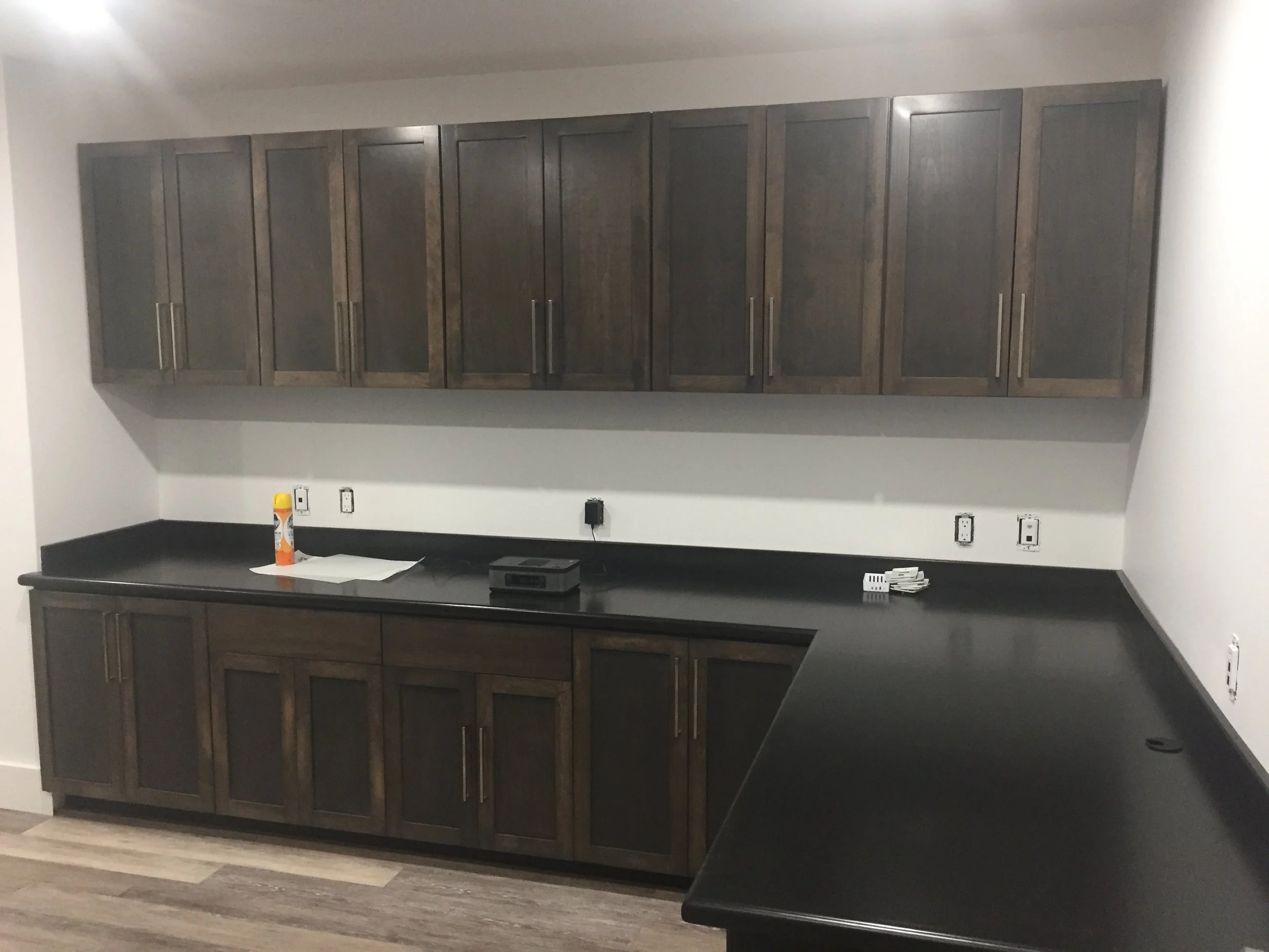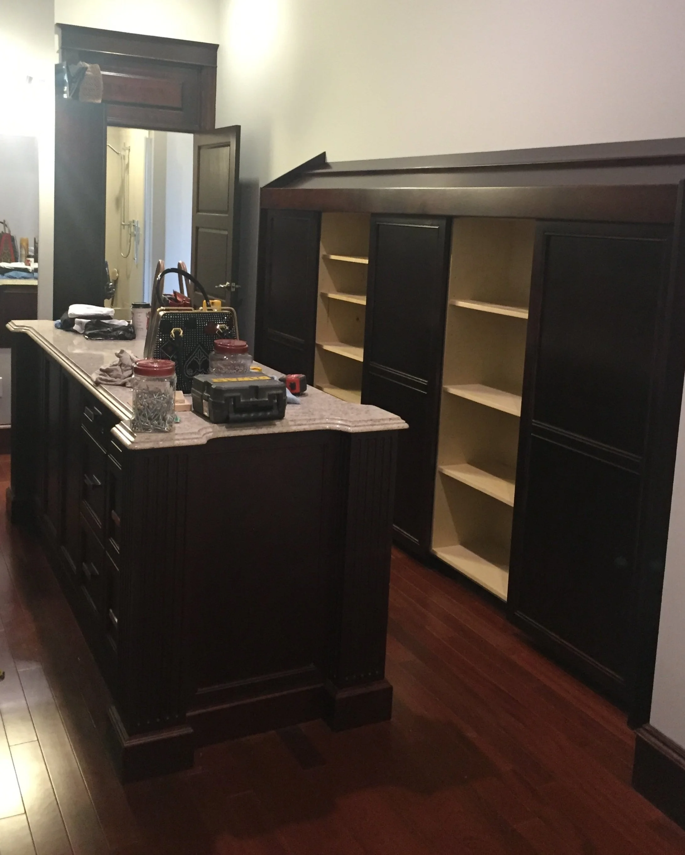 Sometimes, a few simple pieces can really complete a space. A Set of cabinets was added to either side of this roomy walk-in to give every item a home and to help keep things looking clean and organized behind the bypass doors. Built to match the pre-existing island in the room, these cabinets helped to complete the space and give it the little something extra it was missing before. To see more renovations and other work our team has done, click below to view our full gallery.