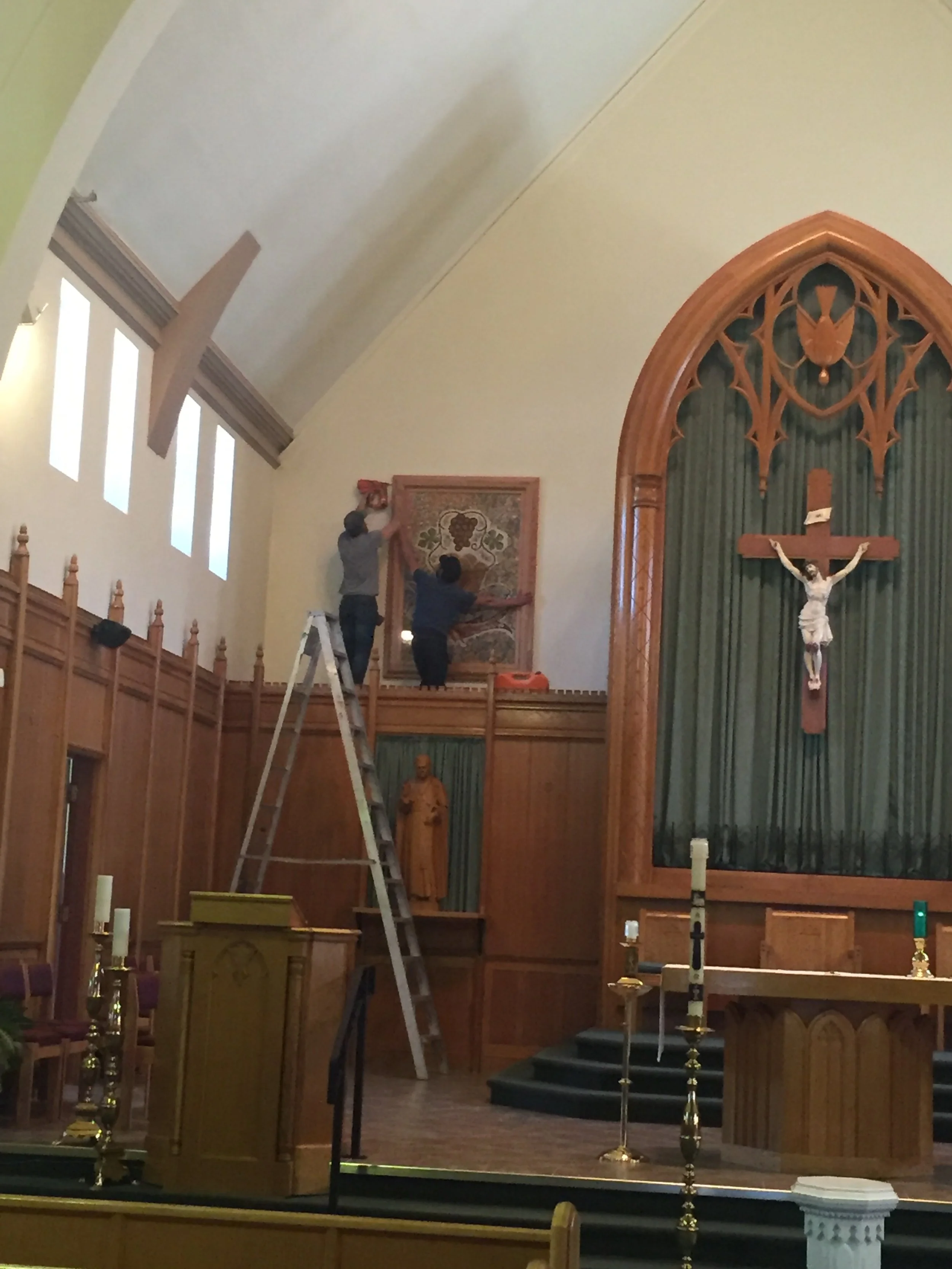 When the original frames started to show their age, these unique pieces deserved a new home. Working with the original frames as reference, our team was able to re-create the design and profile of the old frames to ensure they still matched the rest of the woodworking of the church. To see more images of this and other restoration work our team has done, please click below.